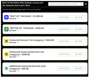 Our eCommerce integration allows you to sell ad spaces, featured listing upgrades, or custom packages​ for both the nomination and voting phases. Purchasing can happen BEFORE nomination ballot opens through the end of voting phase​ and businesses can upload their own assets!