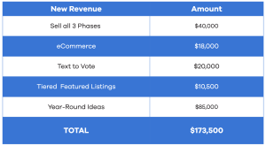 • Best Of Winners Newsletter: Craft a new newsletter that highlights the winners of your ballot per category. You can charge $500-$800 per winner and send 1-2 newsletters per month. This could help bring in $20,000 in additional revenue.